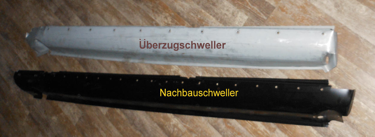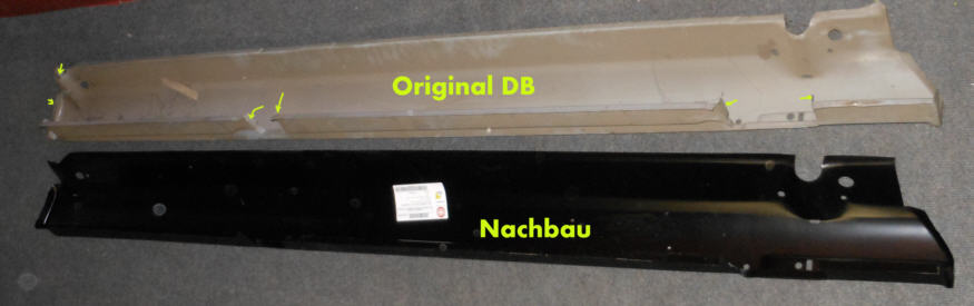 Original dürfte der Schweller 1,05 mm stark gewesen sein und wog 4594 Gramm. Der italiensische Nachbau wiegt 4356 Gramm. Wenn die fehlenden Umbördellaschen wären, könnte man den Nachbau auf Anhieb kaum unterscheiden. Insgesamt ist der Nachbau lediglich 150 Gramm leichter. Nicht zu verwechseln mit den holländischen Überziehschwellern (Bild unten/graues Teil) die wiegen nur 3000 Gramm und sind schon von der Form her völlig anders bzw. abgespeckt. Da der originale Schweller schon seit Jahren nicht mehr lieferbar ist, kann man getrost auf diesen Schweller verweisen. Wir werden aber definitiv nochmals vor Ort das Gespräch suchen, da hier lediglich der Endbeschnitt verändert werden muss. Das bekommen wir hin. Abgabe nur an Vereinsmitglieder. |